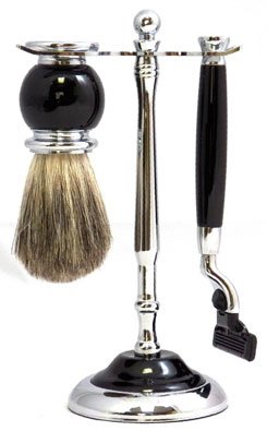first-class accessory for you...or the man who "has everything". Includes MACH 3 razor (razor blade not included) and badger brush together on an attractive matching stand. Black Ceramic and silver-plated. Tarnish-proof. An outstanding addition to every man's bathroom