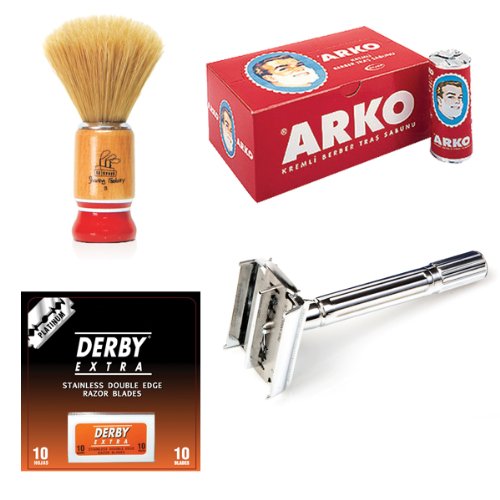 SF199-Shaving Factory DE Safety Razor, Hand Made Shaving Brush (S size), Arko Shaving Soap and 10 Derby Extra Double Edge Razor Blades. Great Valentines Day Gift Set. Review